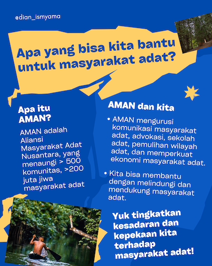 Masyarakat adat di Indonesia berkumpul di AMAN, dengan lebih dari 500 komunitas, dan lebih dari 200 juta jiwa. AMAN memiliki barisan pemuda adat nusantara, persekutuan perempuan adat, persatuan pengacara, dan yang terbaru pada tanggal 9 Agustus launching asosiasi jurnalis masyarakat adat. Jurnalis-jurnalis dari kampung ini menjadi tonggak komunikasi masyarakat adat, dan advokasi. AMAN mendirikan sekolah adat, membantu bagaimana masyarakat adat berhadapan dengan masalah adat, memperkuat ekonomi masyarakat adat, serta melakukan upaya-upaya pemulihan di wilayah adat akibat perusakan perusahaan atau kerusakan alam akibat krisis iklim. AMAN memanggil anak-anak muda untuk pulang kampung menjaga dan memelihara wilayah adat. Anak muda yang depresi dan tidak cocok hidup di kota, pulang untuk hidup yang lebih baik. Kalau sahabat ismi ingin tahu lebih detail tentang AMAN, langsung cek ke www.aman.or.id